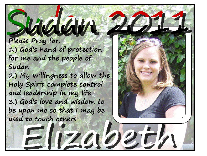 4. Dear Lord Bless and keep Elizabeth in every thing she does. Let her be a beacon shining into the darkness. Thank you for allowing her to be Tabithas teacher. She has been one of the great inspirations in Tabas life. Use her mightily in your kingdom. Give her peace and saefty and surround her always with your love. Give her great favor in the eyes of the people of Sudan. Let her always feel the love and prayers of those at home who support her. May many souls come to you through her love reaching out to them. Thank you for all your blessings. Amen
